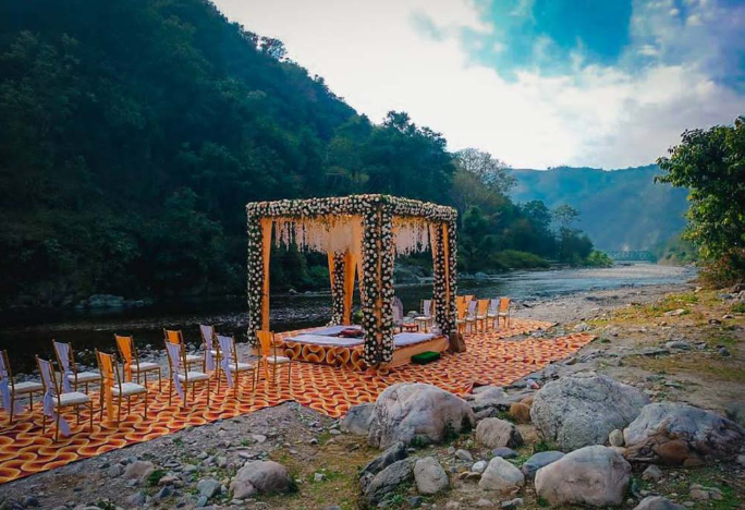 Imagine saying your vows with the Ganga flowing beside you, soft bells ringing in the background, and mountains holding space around you. Riverside venues give you natural beauty without needing much décor—just candles, flowers, and love.